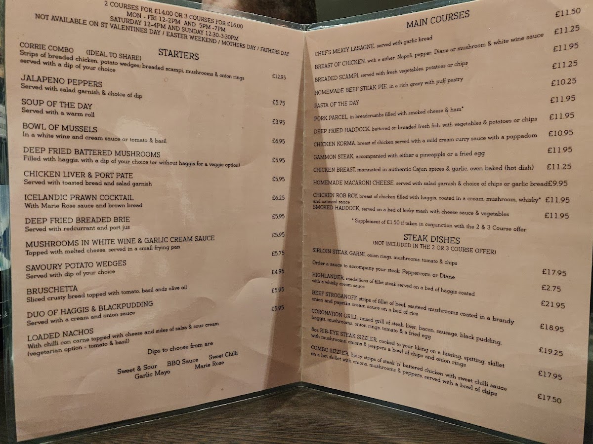 Guests can expect familiar favourites alongside some distinctive choices. Highlights like sticky toffee pudding and Cadbury Flake cheesecake provide warm, satisfying finishes to the meal, while mains such as gammon steak, pork medallions in cream pepper and brandy sauce, and homemade beef steak pie speak to generous, comforting portions.